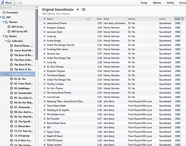 아래 이미지는 007 시리즈의 '오리지날 사운드트랙' 폴더에 들어있는 뮤직 리스트다. 이렇게 폴더에 있는 곡들을 리스트 형태로 보면 출시년도(Year) 순으로 소팅이 가능하다. (이미지 오른쪽 상단을 보면 'Year'가 하이라이트되어있다)